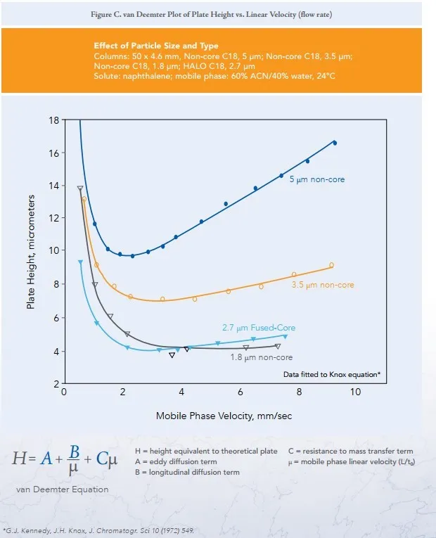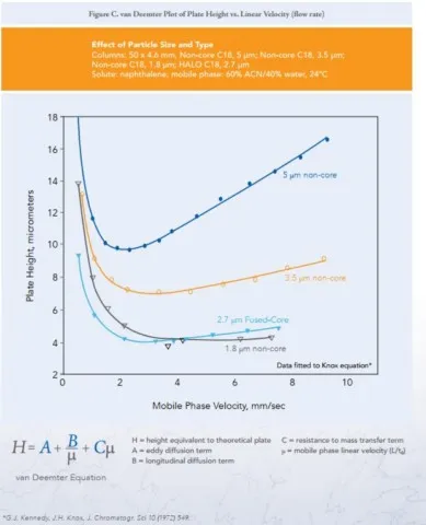 Choć samo równanie jest uniwersalne, krzywe van Deemtera dla GC i LC wyglądają nieco inaczej ze względu na różnice w fizykochemii gazów i cieczy. Przyglądając się temu tematowi, warto zerknąć na wykresy odpowiadające danej technice (cieczowej bądź gazowej). Poniżej przykład krzywej dla kolumn HPLC / UHPLC, w tym AMT HALO z ziarnem 2.7mikrona Fused Core: