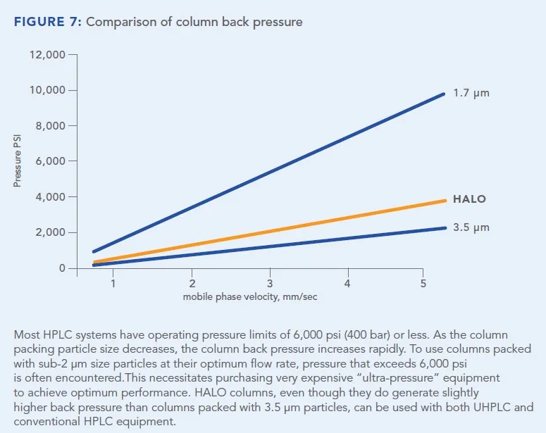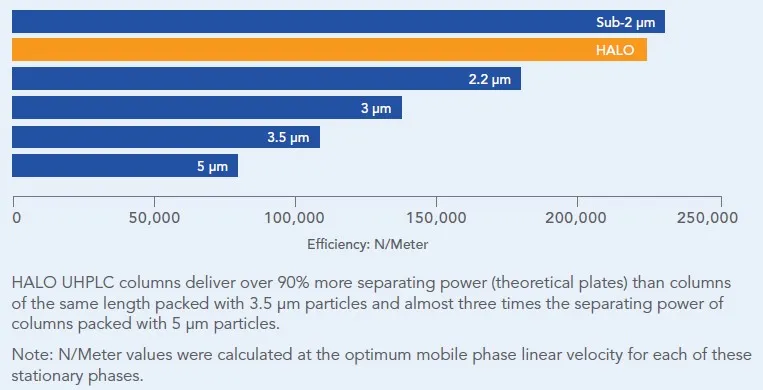 - Szybkie analizy bez konieczności zakupu drogiego sprzętu ultraciśnieniowego. Kolumny HALO działają optymalnie w szerokim zakresie stosowanych przepływów. Aby osiągnąć pożądane rezultaty należy tak ustalić przepływ przez kolumnę, by ciśnienia robocze ustabilizowały się na dopuszczalnym dla chromatografu poziomie. Może być to 100bar, 200bar... aż do 600 bar!