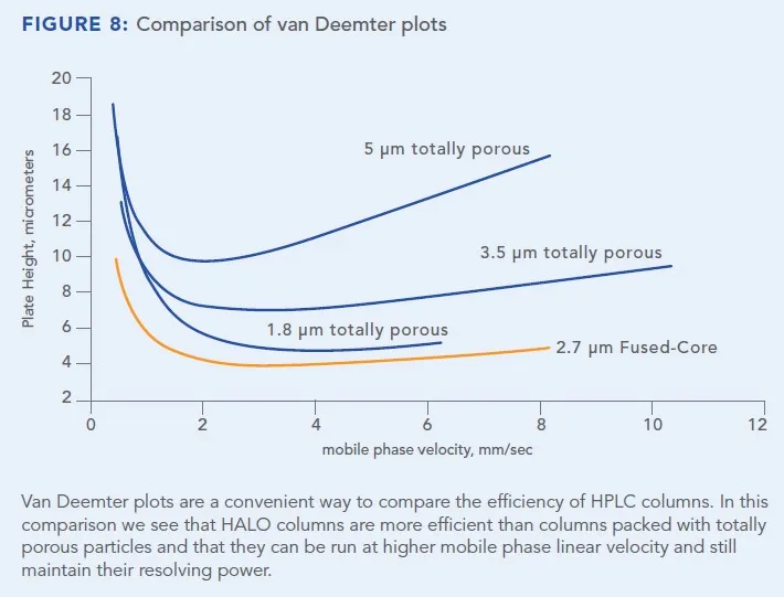 - Niskie ciśnienia robocze i płaska krzywa zależności pomiędzy prędkością przepływu a sprawnością kolumny. Pozwala na zwiększanie szybkości przepływu bez utraty parametrów rozdziałów. Uzyskuje się dodatkowe skrócenie czasu analiz