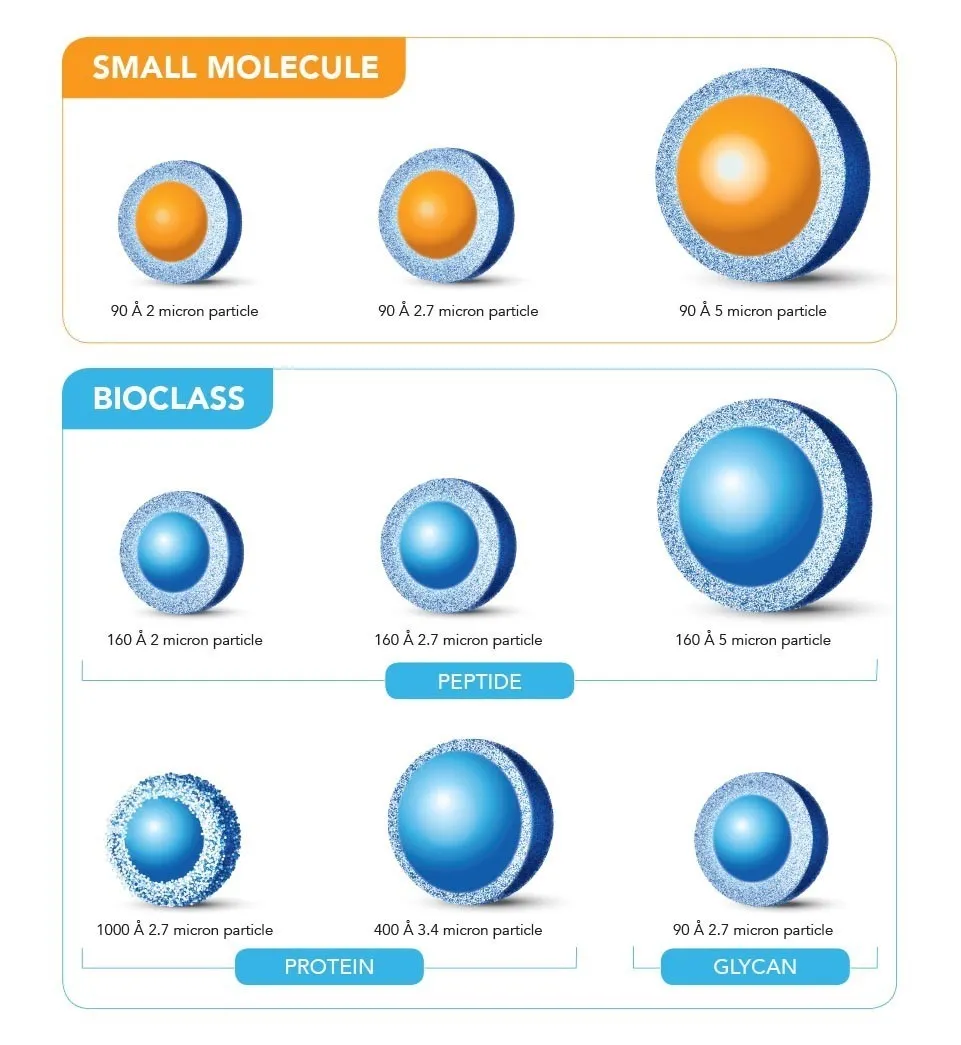- C18, C8, Phenyl-Hexyl, Amide, HILIC, PBP (pentabromophenyl)